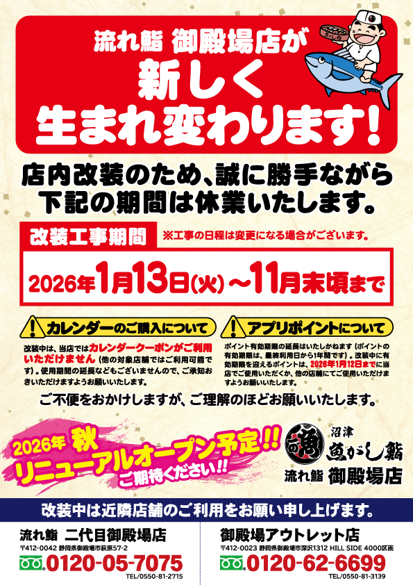 改装工事に伴う休業のお知らせ[流れ鮨 御殿場店]