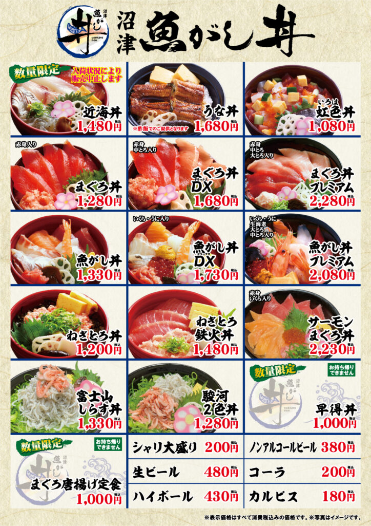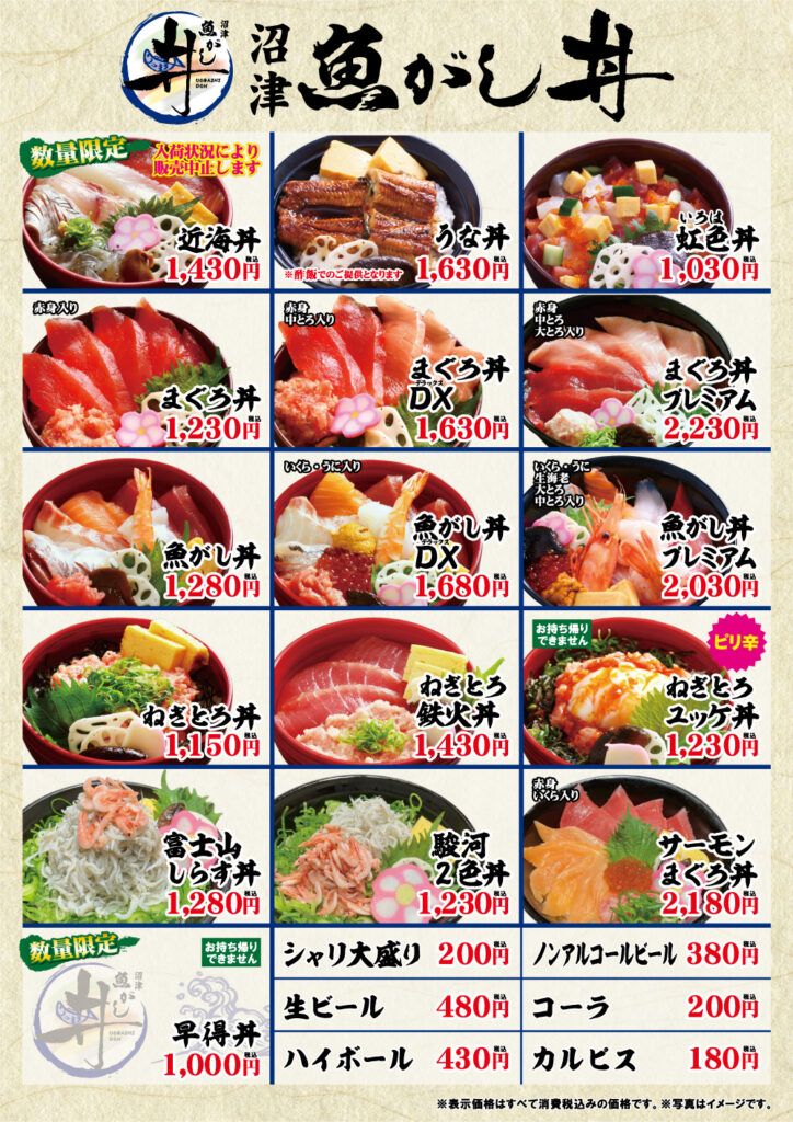 店舗のご案内 沼津魚がし丼 アスティ静岡店 住所 〒420-0851 静岡県静岡市葵区黒金町47 JR静岡駅 アスティ静岡西館 電話 054-286-2276 営業時間 11:00~21:00(L.O.20:30) 定休日 なし アクセス JR静岡駅からすぐ 《メニュー》 \テイクアウト承ります!/ 店舗外観