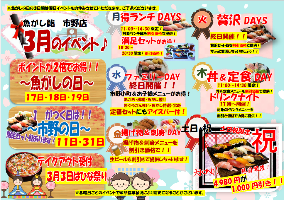 日替わりでお得なイベントやってます。